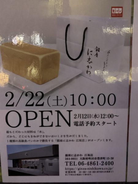 江坂に高級食パン専門店の「に志かわ」がオープンします! 2月22日らしい。 それも店の真裏です。