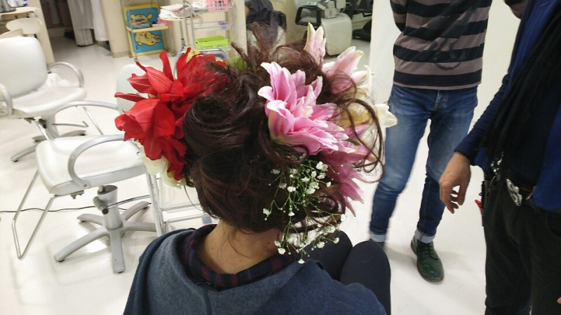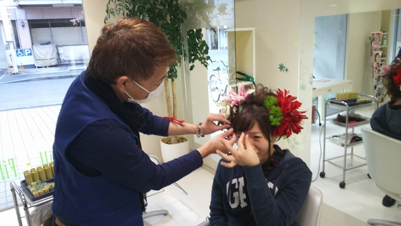 小野さんがアシスタントのむっちゃんの成人式ヘアセットをしてました![]()